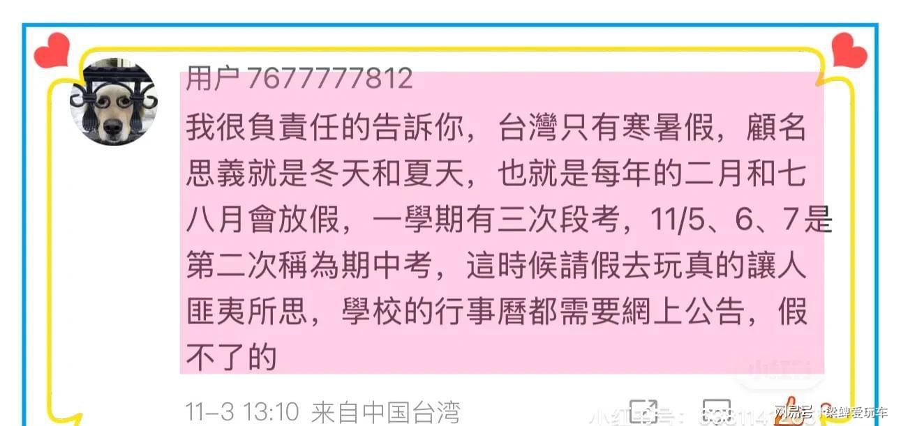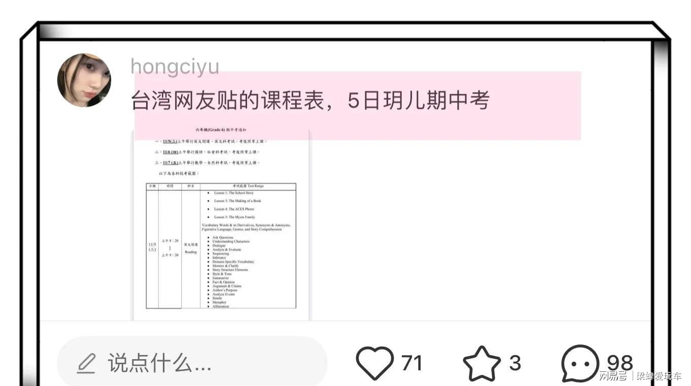 台媒报道完,不少网友炸锅了,有不少网友晒出台北私立学校的课程表,11月5.6.7三天要期中考试,不少网友在评论区怒斥汪小菲一家为了流量不管孩子,没有秋假,撒谎称有假,更有甚者说多马筱梅带孩子出去玩几次,孩子就不爱上学了,就养废了,言外之意质疑其用心!
