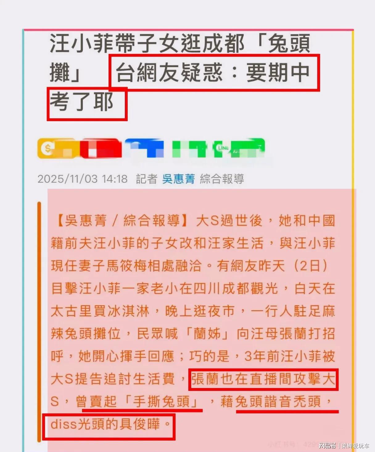 昨天台媒报道汪小菲一家成都度假,标题醒目的写着“网友质疑要考试了”,言外之意要考试了,还带孩子出去玩,内涵其为了流量不管孩子考试,因为偶遇照是一家人卖兔头,台媒文中还提起张兰曾在直播间手撕兔头,暗示兔头就是秃头,不得不说台媒记忆力挺好那都是3年前的事了!