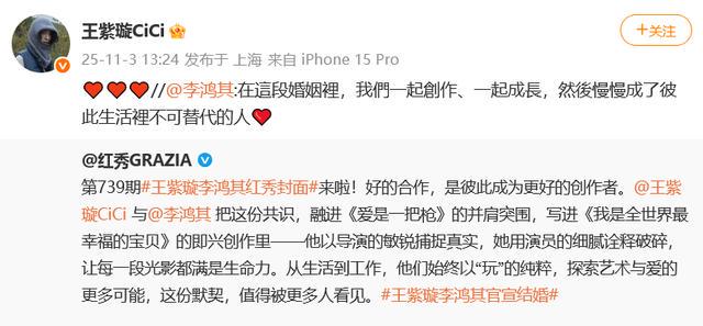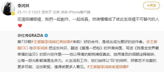 据@新浪娱乐 消息,王紫璇和李鸿其在社交平台发文官宣结婚:“在这段婚姻里,我们一起创作、一起成长,然后慢慢成了彼此生活里不可替代的人。”